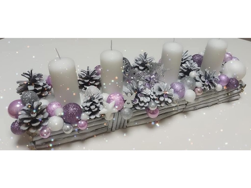 Adventný svietnik 50 cm dlhý, 15 -18 cm šírka , drievka, šišky ošetrené dekoračným bielym resp. bezfarebným lakom.