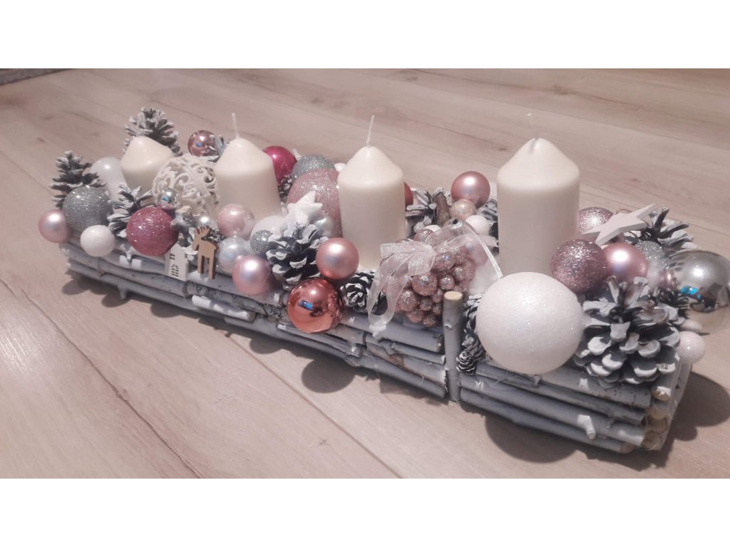 Adventný svietnik 50 cm dlhý, 15 -18 cm šírka , drievka, šišky ošetrené dekoračným bielym resp. bezfarebným lakom.