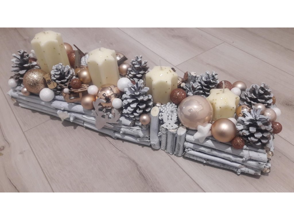 Adventný svietnik 50 cm dlhý, 15 -18 cm šírka , drievka, šišky ošetrené dekoračným bielym resp. bezfarebným lakom.