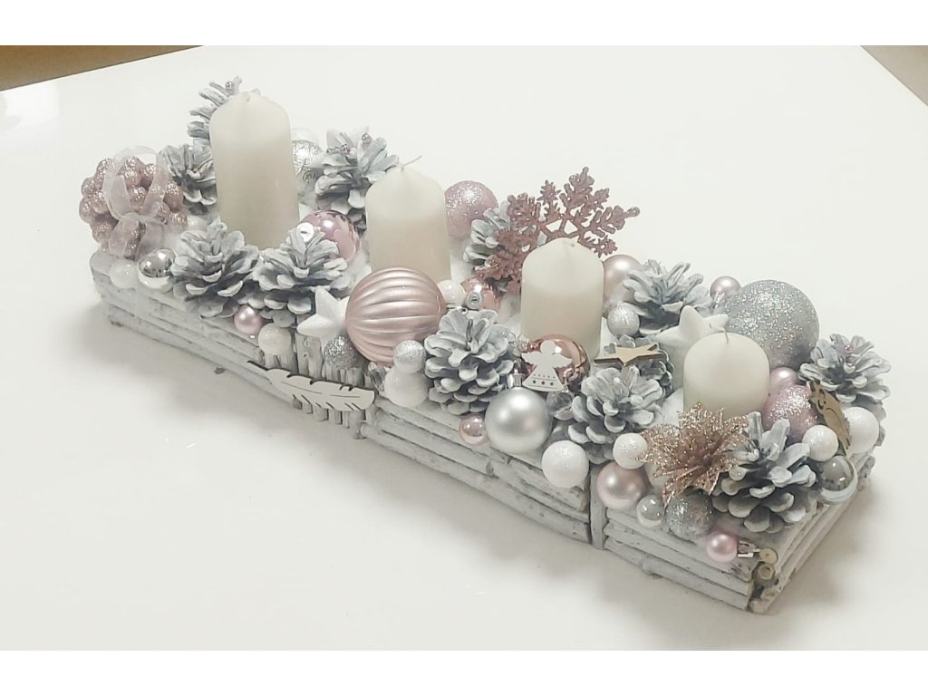 Adventný svietnik 50 cm dlhý, 15 -18 cm šírka , drievka, šišky ošetrené dekoračným bielym resp. bezfarebným lakom.