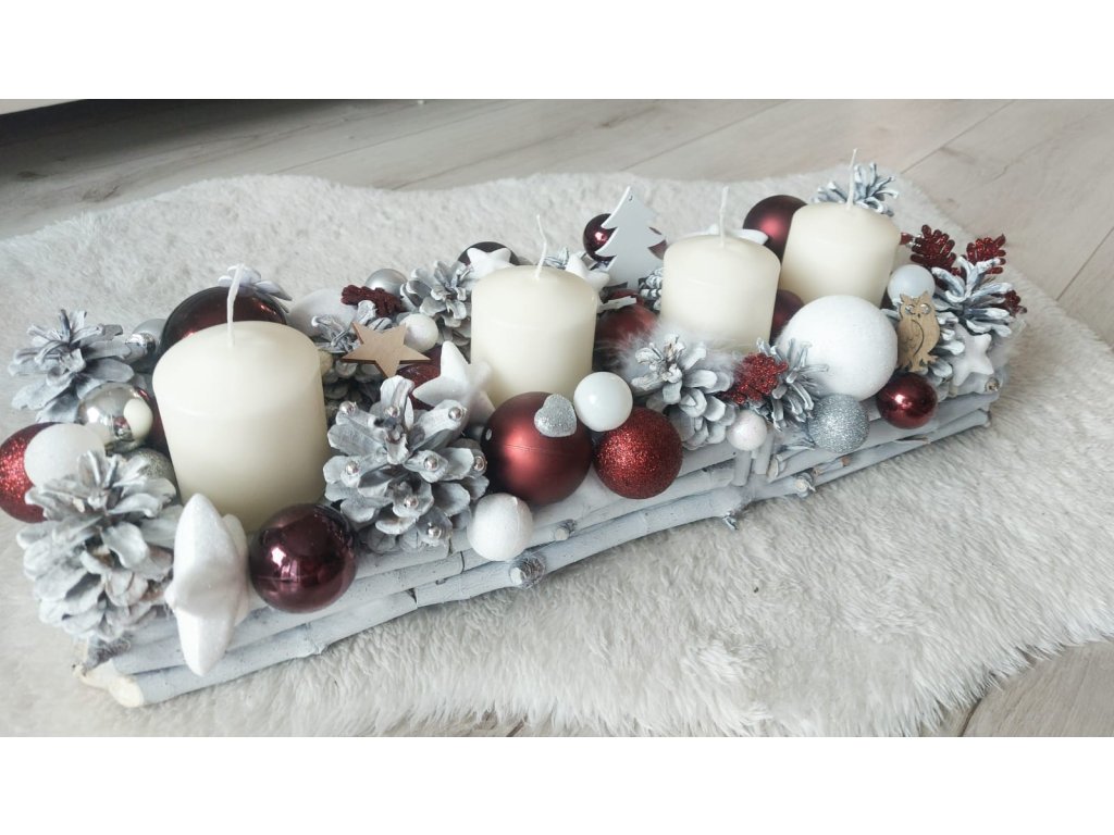 Adventný svietnik 50 cm dlhý, 15 -18 cm šírka , drievka, šišky ošetrené dekoračným bielym resp. bezfarebným lakom.