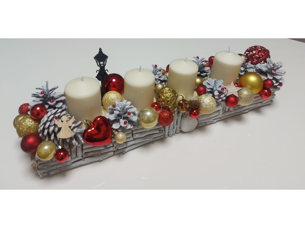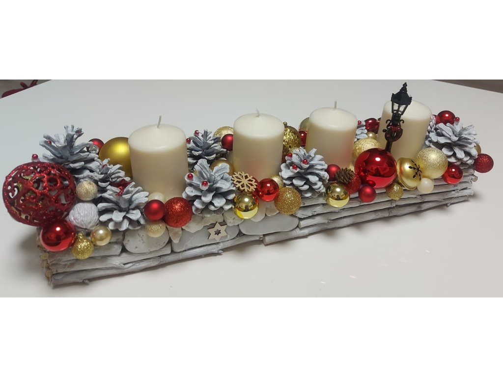 Adventný svietnik 50 cm dlhý, 15 -18 cm šírka , drievka, šišky ošetrené dekoračným bielym resp. bezfarebným lakom.