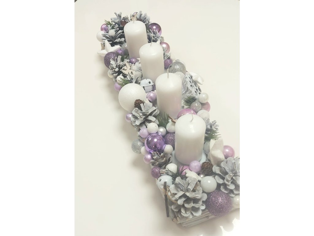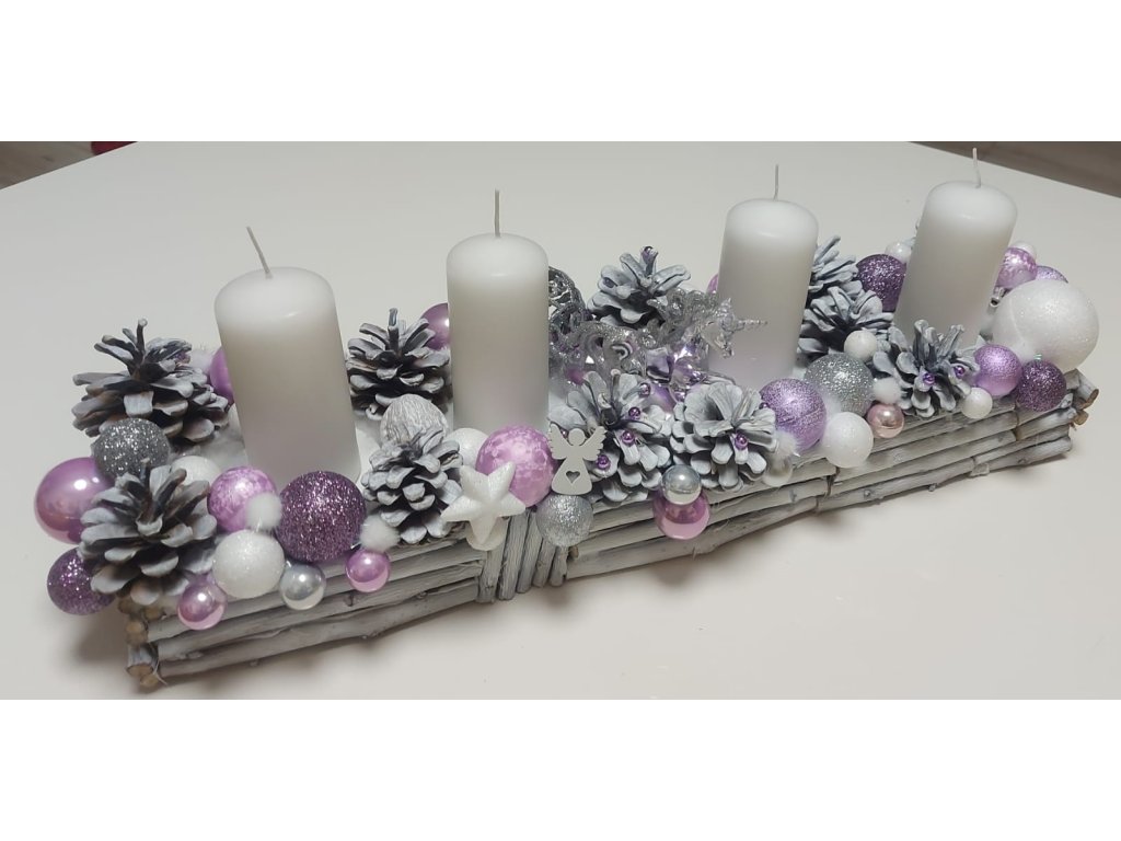 Adventný svietnik 50 cm dlhý, 15 -18 cm šírka , drievka, šišky ošetrené dekoračným bielym resp. bezfarebným lakom.