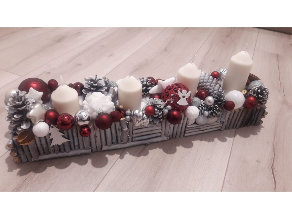 Adventný svietnik 50 cm dlhý, 15 -18 cm šírka , drievka, šišky ošetrené dekoračným bielym resp. bezfarebným lakom.