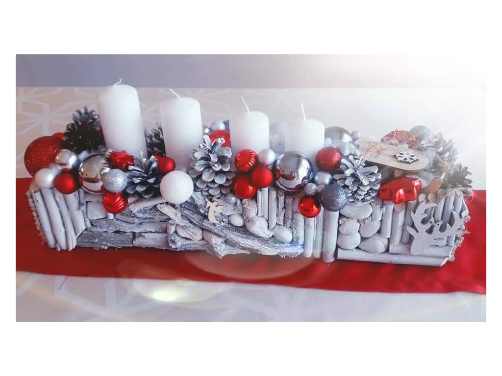 Adventný svietnik 50 cm dlhý, 15 -18 cm šírka , drievka, šišky ošetrené dekoračným bielym resp. bezfarebným lakom.