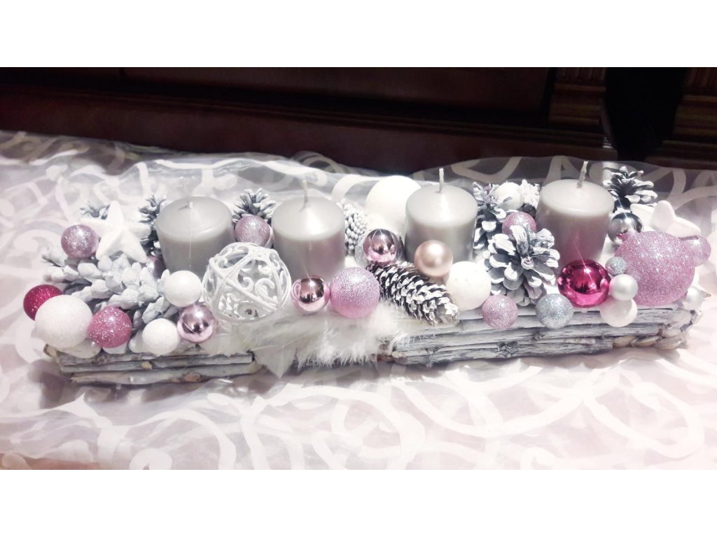 Adventný svietnik 50 cm dlhý, 15 -18 cm šírka , drievka, šišky ošetrené dekoračným bielym resp. bezfarebným lakom.