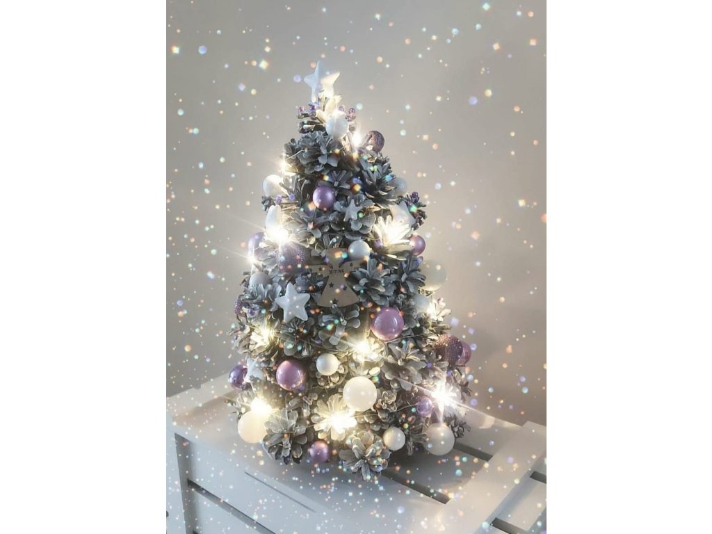 Stromček so šišiek vo výške 40cm, zdobený drobnými ozdobami, so svetelnou reťazou na batérie. Šišky sú upravené s matným bielym dekoračným lakom.