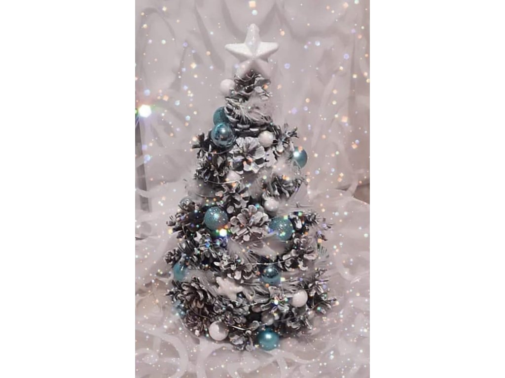 Stromček so šišiek vo výške 40cm, zdobený drobnými ozdobami, so svetelnou reťazou na batérie. Šišky sú upravené s matným bielym dekoračným lakom.
