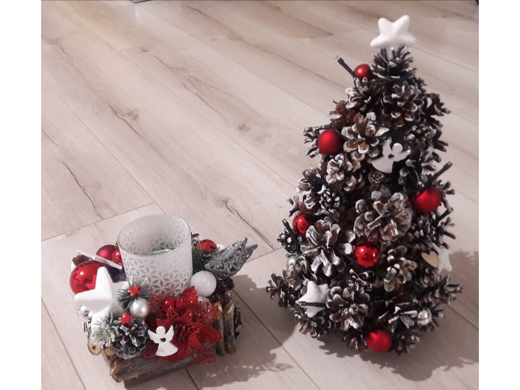 Stromček so šišiek vo výške 40cm, zdobený drobnými ozdobami, so svetelnou reťazou na batérie. Šišky sú upravené s matným bielym dekoračným lakom.