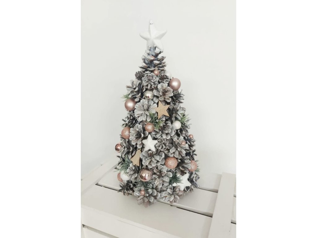 Stromček so šišiek vo výške 40cm, zdobený drobnými ozdobami, so svetelnou reťazou na batérie. Šišky sú upravené s matným bielym dekoračným lakom.
