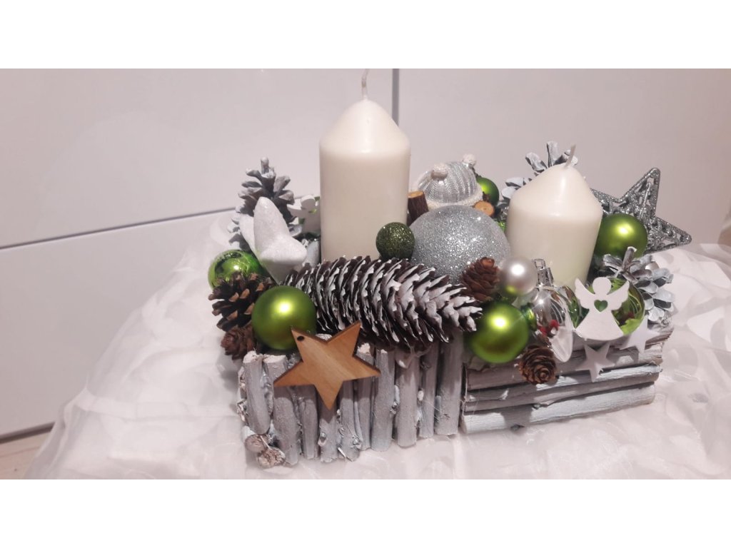 Svietnik 15x20 cm, drievka, šišky ošetrené dekoračným bielym resp. bezfarebným lakom.