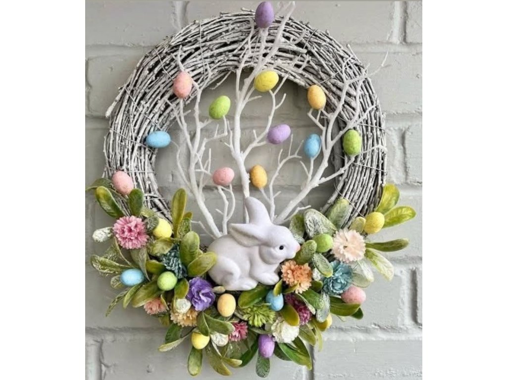 Veľkonočný veniec z prírodných materiálov doplnených o dekoračné prvky.
